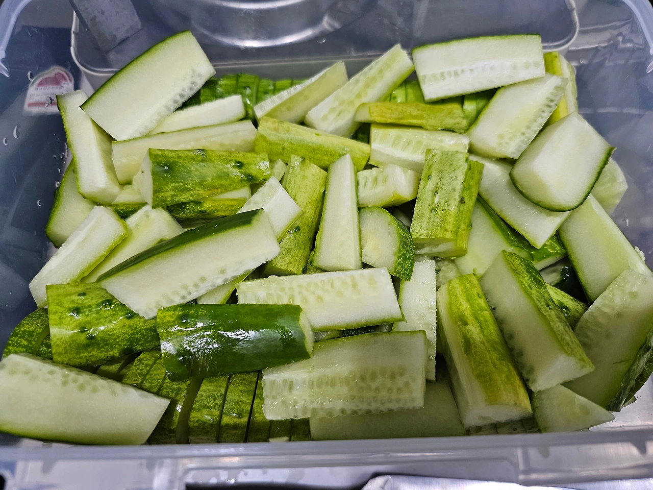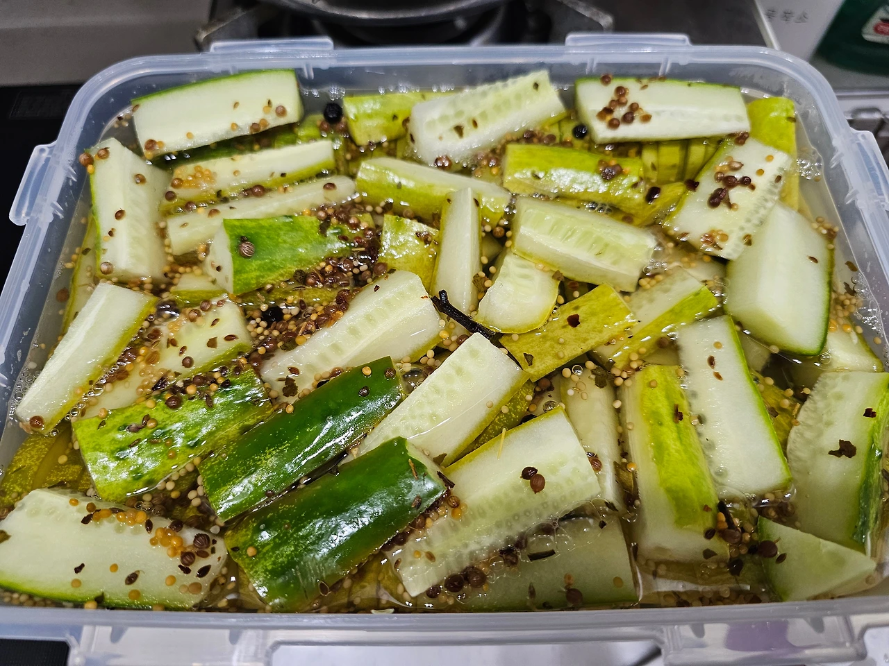 처음 만든 피클에서 다 골라 먹기 직전, 새로운 오이를 사서, 직전의 피클 소스에, 새로운 소스를 첨가하여 끓여서 새로운 피클로 만들기!
