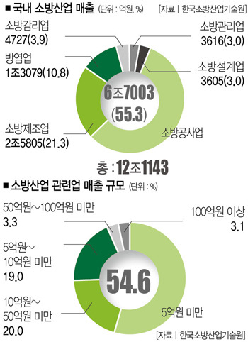 2014년 KFI(한국 소방산업기술원) 자료에 의하면 국내 소방산업의 연간 총 시장규모는 약 12조 정도이다. 소방방재학과 교수님이 보여주셨던 2016년 국내 소방산업 시장규모도 이와 비슷하다. 국내 소방산업의 시장은 B2B(기업과 기업)나 B2G(기업과 국가) 판매를 많이 한다. 또한 국내 소방산업에서 대부분의 비중을 차지하는 업은 소방공사업과 소방제조업이다.