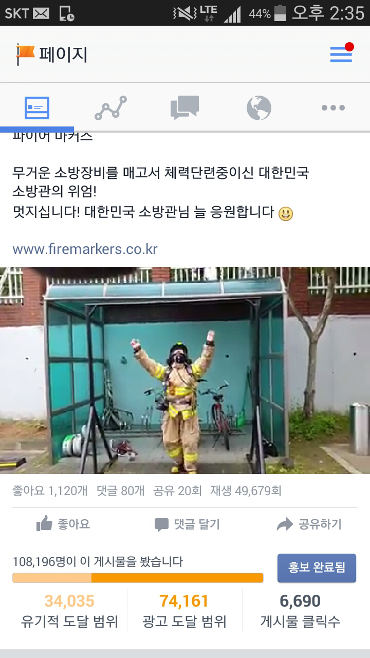 우리는 지난2년간 페이스북 마케팅에 비용을 쓰지않았다. 잘몰라서 안썻다. 그대신 발품을 팔았다. 좋아요수가 많아야 사람들에게 노출되는 수가 많구나를 깨닫고 강연의 기회를 얻게될때 학생들에게 좋아요를 누른 사람들에 한하여 추첨해서 문화상품권 5천원을 주겠다고하였다. 생각보다 반응이 폭발적이였다. 순식간에 좋아요수가 100에서 500까지 올랐다.(강의내용은 파이어 마커스를 창업한 과정에 대한 부분이였다. 민망하지만 기업가정신으로 좋은 기회가 주어졌었다.) 우리는 이 폭발적(?)반응을 확인한후 2~3회정도 같은 방법을 사용하여 좋아요수를 1000이상 확보하였다. 이후 제품이외에 무엇을 보여줄수있을까 생각하다가 파이어 마커스하면 소방관을 떠올리게 하고싶었다. 그래서 소방관에 대한 이야기도 페이스북에 게시하게되었다. 반응이 제품보다 좋았다. 요근래 페이스북에 광고비용을 사용하면 더 많은 사람들에게 브랜드를 알릴수있다는 조언을 받고 광고비용을 썻다. 스타트업이니 많은 비용을 지출할수없다. 소방관분이 장비 40kg을 매고 철봉하시는 영상을 올렸더니 반응이 좋았다. 여기에 약 10,000원 광고비용 지출로 더 많은 사람이 게시물을 보게되었다. 신기한건 게시물 도달과 동시에 좋아요수가 100개정도 같이 늘었다는것이다.