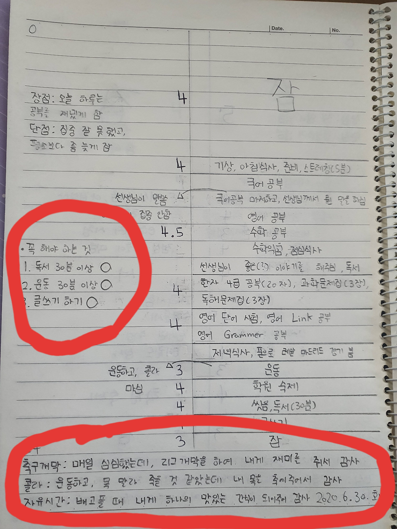 아이들에게 데일리 리포트 쓰는 법을 가르쳐준지 약 2주가 지났다. 아이들은 여전히 꾸준하게 자신들을 하루를 종이에 기록해나갔다. 수한이의 데일리 리포트를 검사하고 있는데 특이한 점을 발견했다.