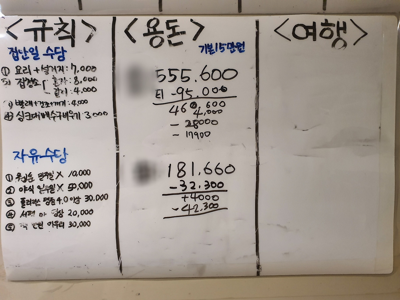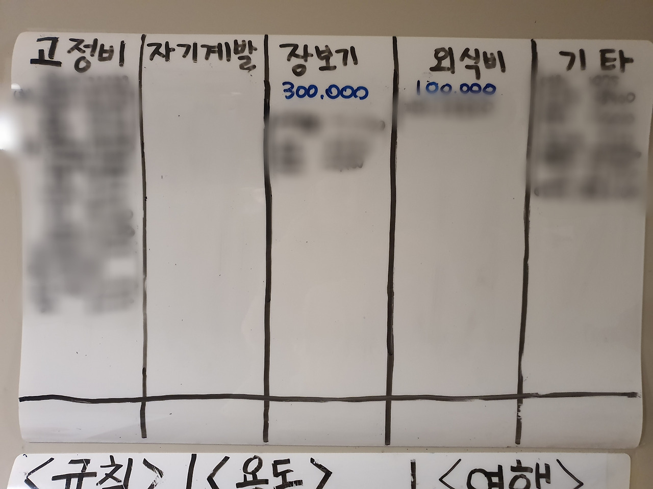 먼저 우리가 현재 돈을 쓰는 내역들을 전부 화이트보드판에 기록하기로 했다. 고정비, 자기계발, 장보기, 외식비, 기타, 이렇게 총 5가지 카테고리로 나눠서 기록했다.