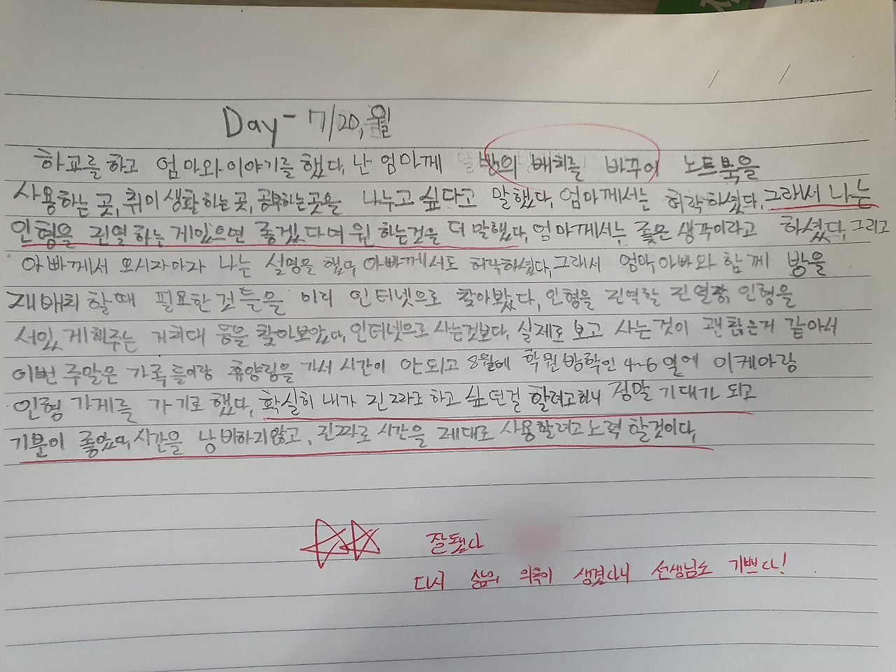 "쌤, 앞으로 저 진짜 열심히 살 거예요. 라이브 방송이나 유튜브 시청이 아닌 진짜 저를 위해서 시간을 쓰고 싶어요. 그리고 공부도 포기 안 할 거예요. 엄마랑 대화를 하고 나니, 공부가 더 하고 싶다는 생각이 들었어요. 선생님, 그동안 계속 신경 써주셔서 감사합니다."