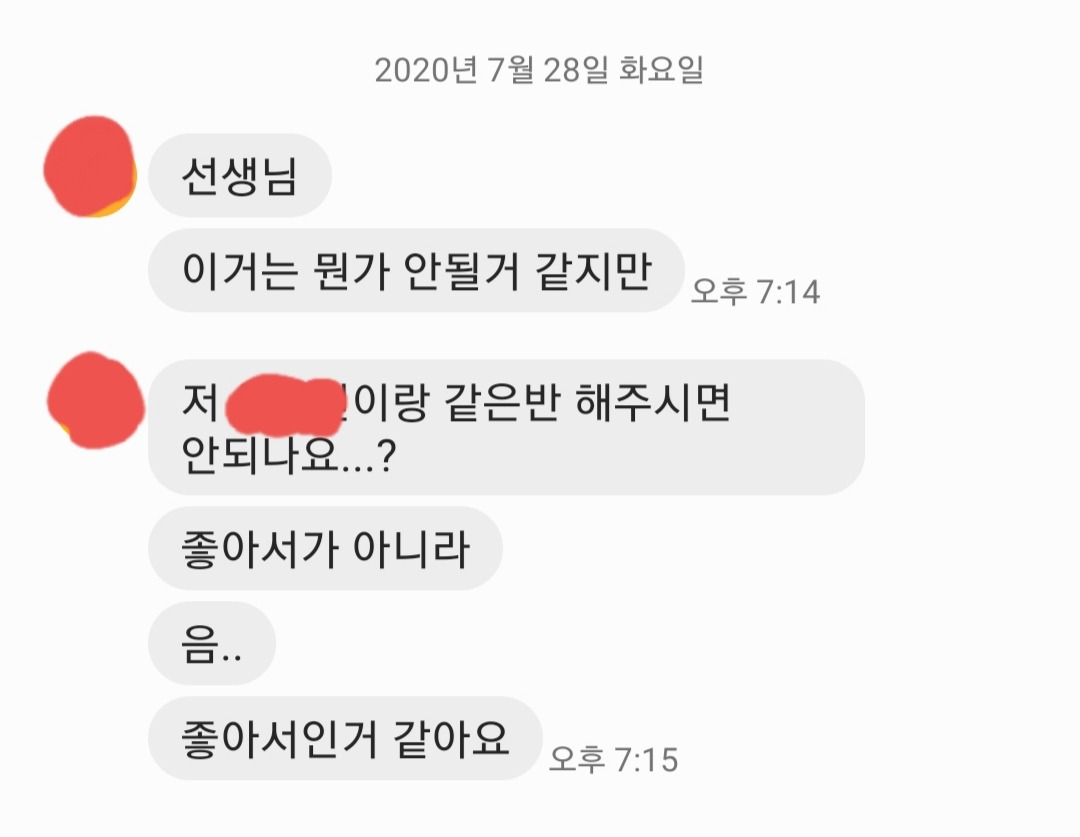 "쌤, 근데 제발 정윤(가명)이랑 같은 반 해주시면 안 돼요? 쌤이 시키는 것은 다 하겠습니다. 공부도 열심히 하고, 쌤 심부름도 잘하고, 수업시간에도 열심히 참여할게요. 제발요. 제발요.... ㅠㅠ"