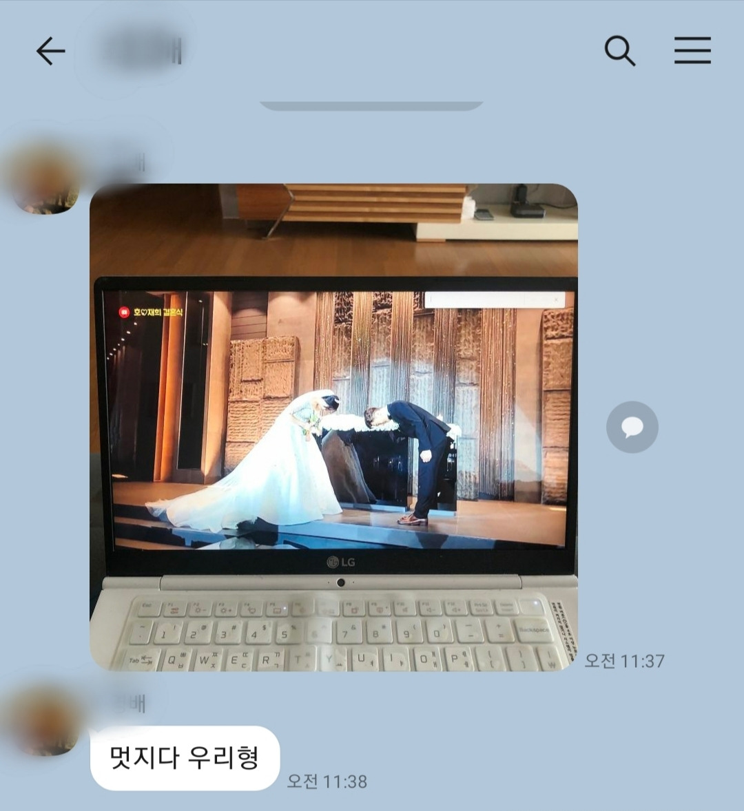 휴대폰, TV, 노트북 등 다양한 전자기기를 이용해 온라인 결혼식을 시청한 하객들 집에서 TV로 유튜브 라이브 결혼식을 시청했다는 친구도 있었고, 노트북을 통해 온라인 결혼식을 봤다는 친구도 있었다.