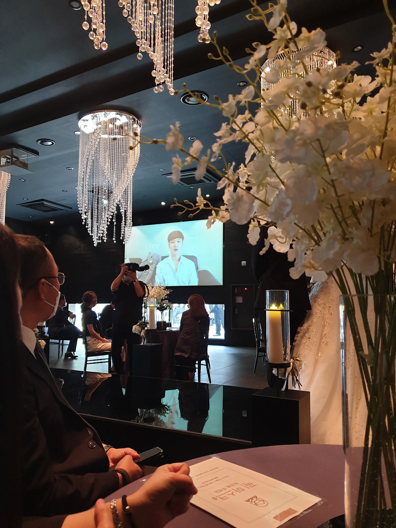 턱시도로 갈아입자마자, 식장으로 향했다. 식장 입구에는 직원들이 출입자에게 QR코드를 찍도록 하고 있었다. QR코드를 찍고 들어가니 아직 홀 내부는 방역 중이다. 홀 앞에서 기다리고 있으니, 오늘 유튜브 라이브 방송 촬영을 도와주기로 한 친구가 도착했다. 혹시 몰라 한 번 더 라이브 방송 기능들이 잘 작동하는지 같이 점검을 했다. 실시간 채팅도 잘 되고, 중간에 동영상도 재생이 잘된다. 실제 현장과 4~5초 정도 시간차가 있긴 하지만 이 정도면 방송하는데 전혀 문제가 없었다. 심지어 화질도 full HD로 좋다! 어제 급하게 유튜브 라이브 실행 어플을 바꿨는데 잘한 거 같다!