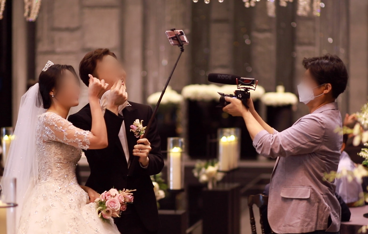 "여러분. 이제 식이 3분 남았습니다. 와... 진짜 긴장되네요. 제 앞에 어머님 두 분 보이시죠? 엄마와 장모님이 입장해서 화촉점화를 하면 그다음에는 제가 입장을 합니다! 저는 이만 친구에게 카메라를 넘기도록 하겠습니다."