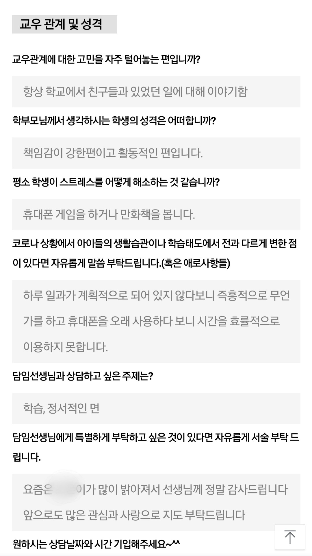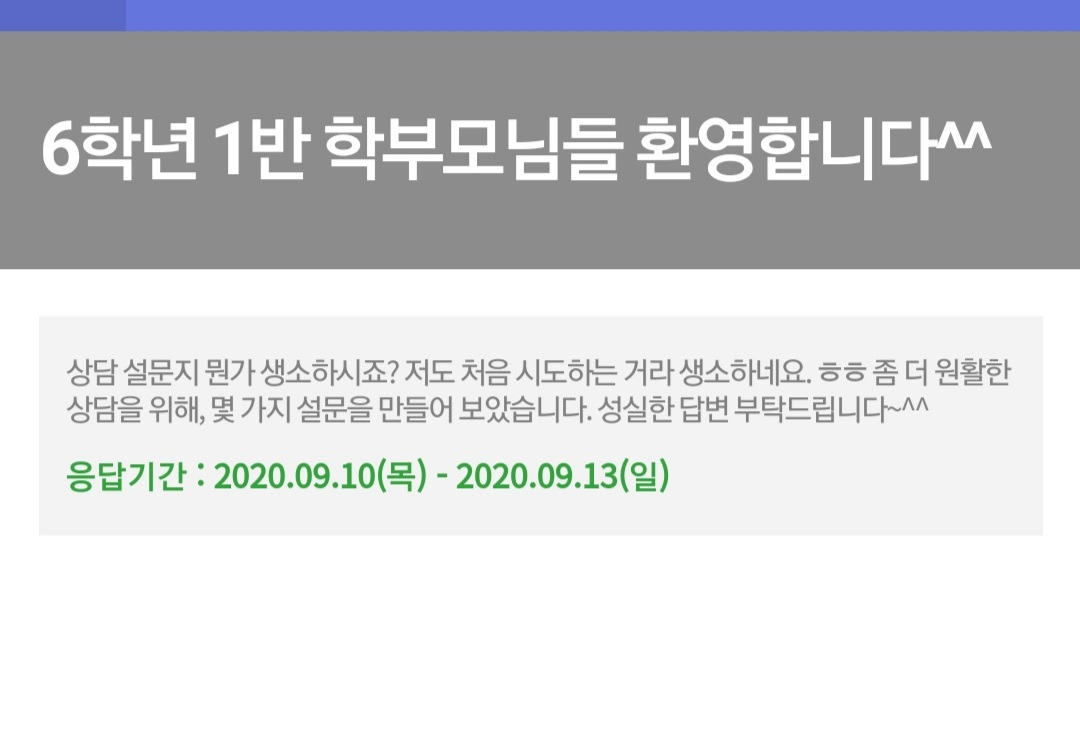 이렇게 설문지를 통해 학부모님이 상담에서 원하는 바가 파악이 되면, 교사는 상담 전 미리 그 내용을 준비할 수 있고, 학부모님에게는 뭔가 준비된 상담이라는 신뢰감을 줄 수 있다.