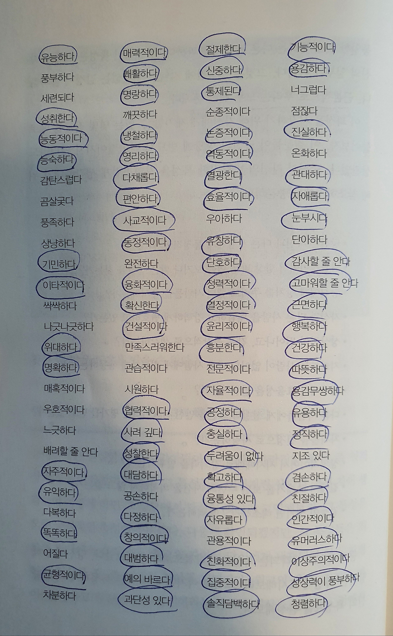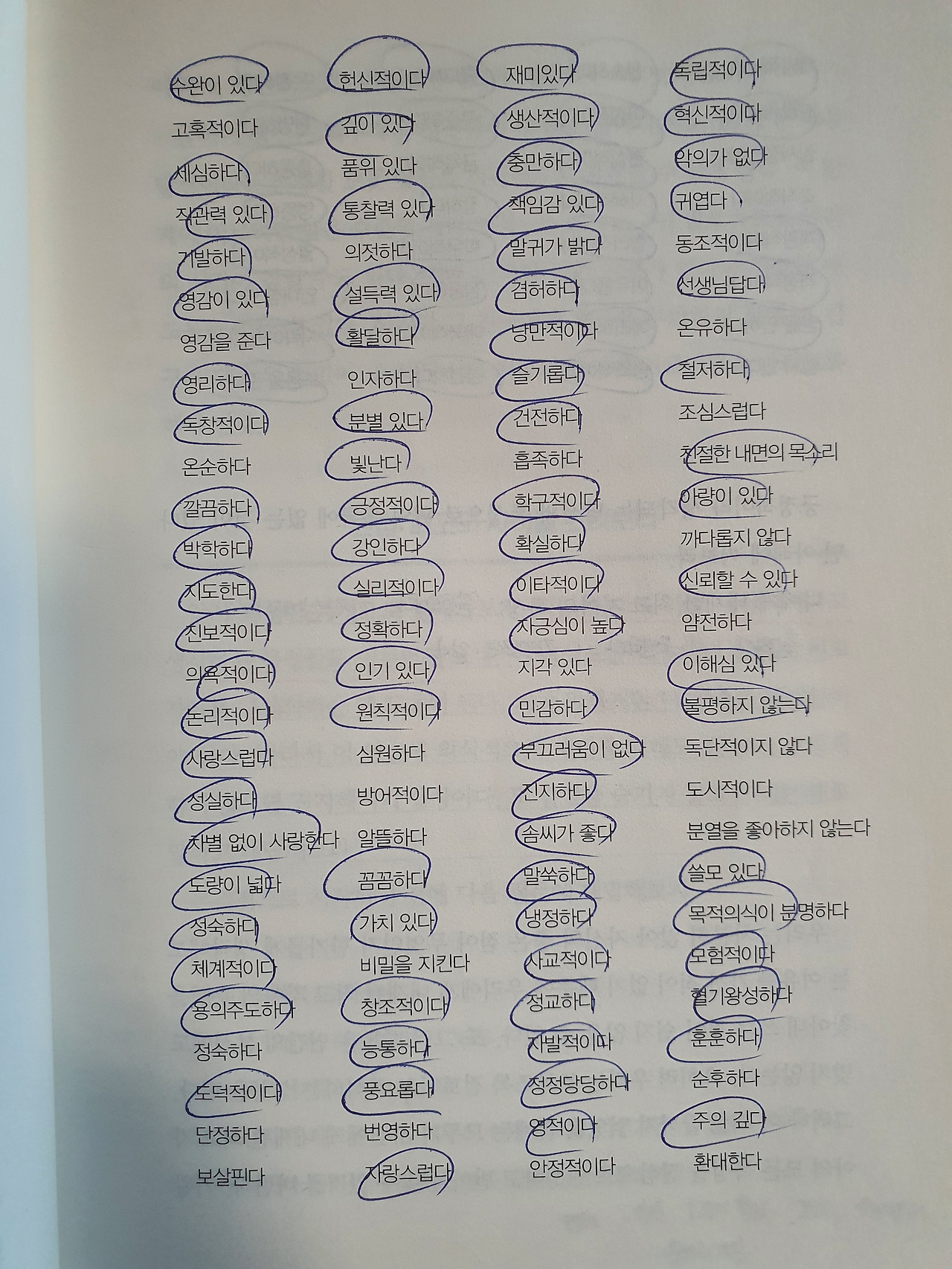여러분의 이상적인 모습과 맞아떨어지는 모든 바람직한 성격 특성들을 빠짐없이 써보자. 이때 주의할 점은 이 특성들은 모두 긍정적인 속성이어야 한다. 만약 내가 긍정적인 속성이 없다면 내가 원하는 모습이나 성격을 적어도 무방하다. 사실 우리 내면에는 무엇이든 될 수 있는 무한한 가능성이 내포되어 있기 때문이다.