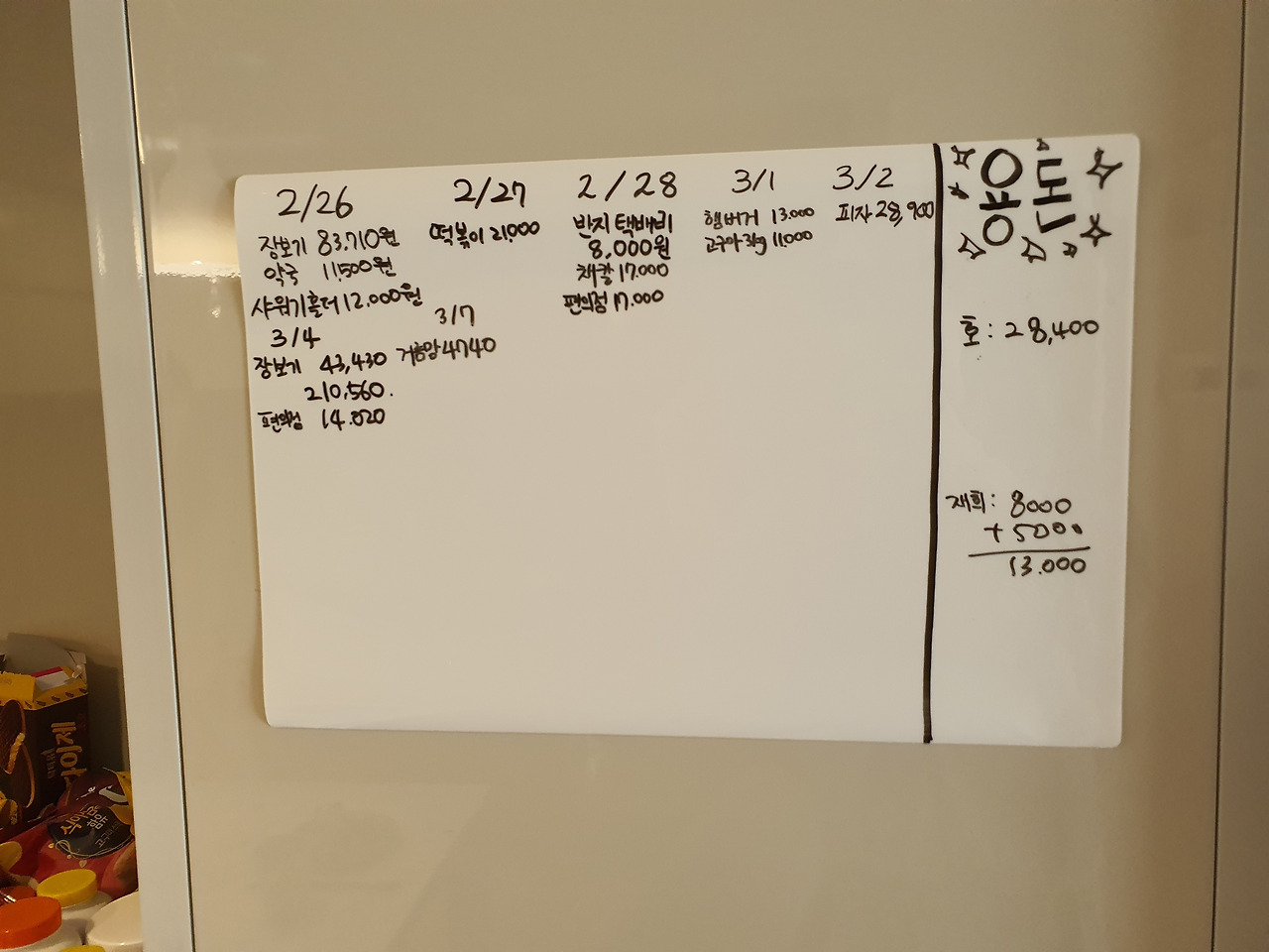 신혼부부인 우리는 돈을 아끼기 위해 각자 한 달 용돈을 정하고(15만원), 하루하루 쓴 돈을 화이트보드에 기록하기로 했다. 그리고 돈을 쓰기 전에는 무조건 상대방에게 허락을 맡기로 했다.(마찰증가) 혹여나 우리의 가치에 맞지 않은 곳에 돈을 낭비할까봐 만든 시스템이다.