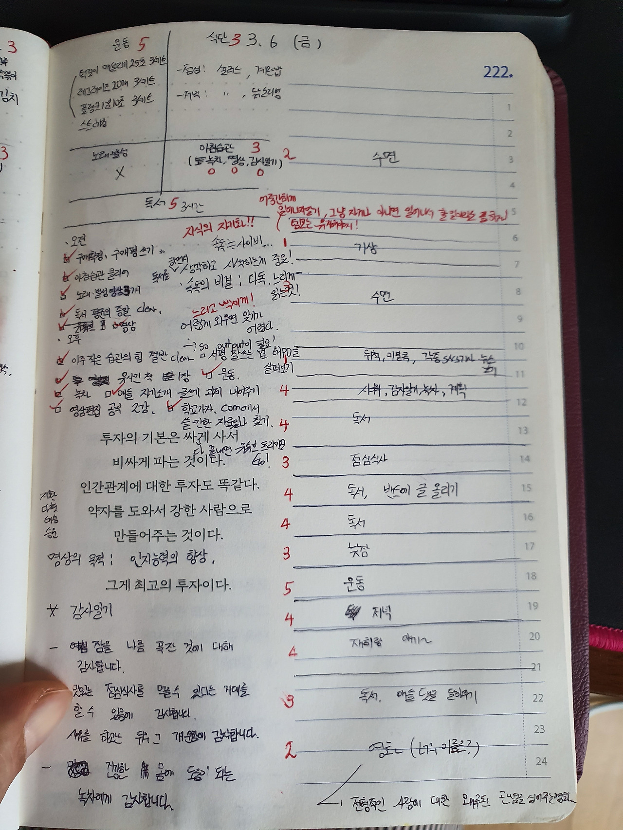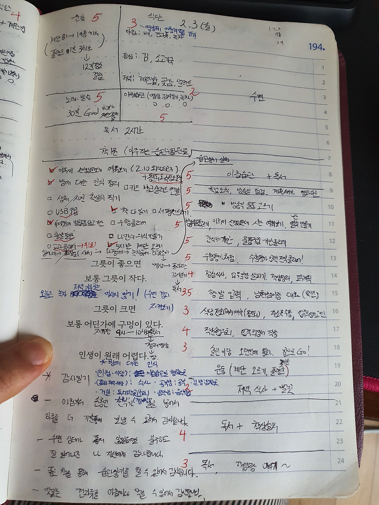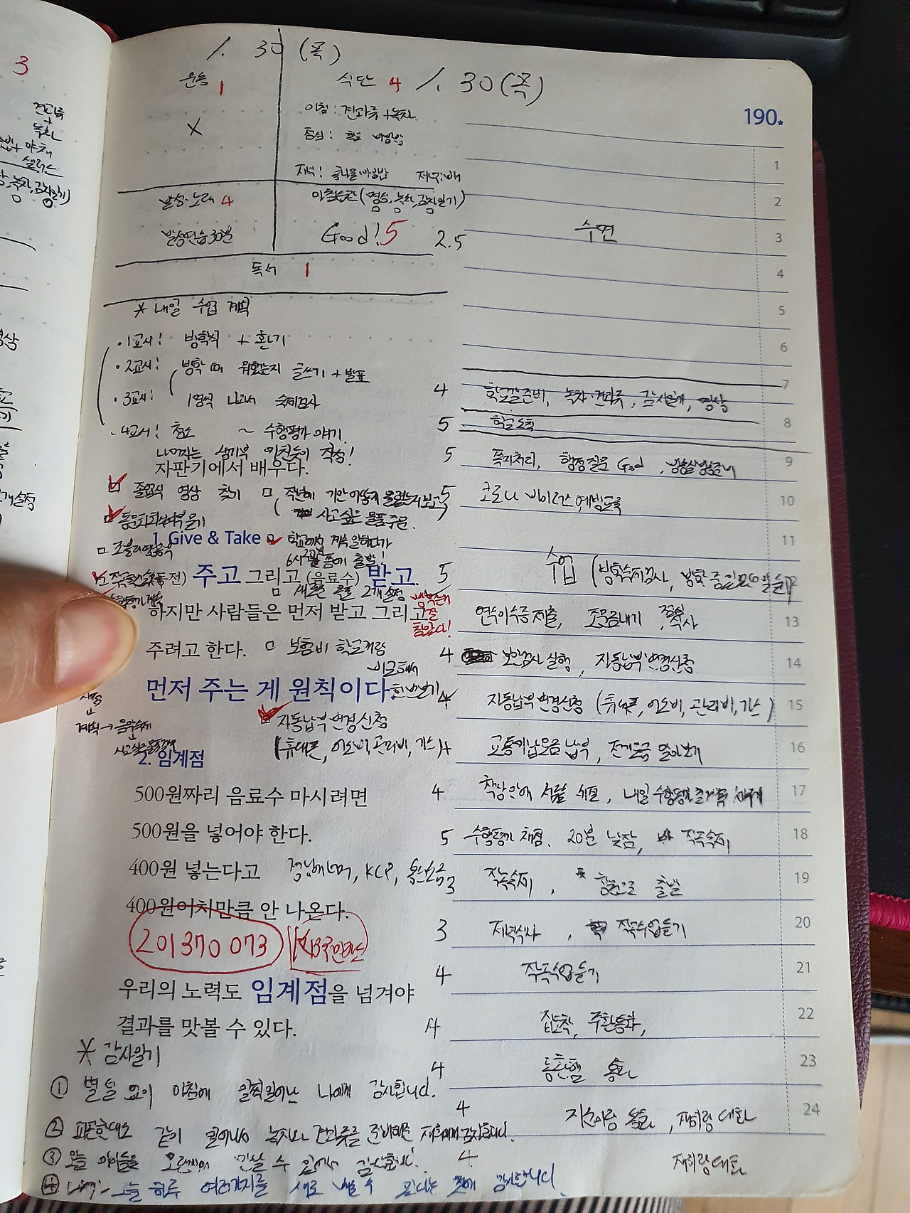 데일리리포트(폴라리스)는 1년 전부터 써왔다. 보통 플래너들이 미래의 일을 계획하는 반면(동작) 폴라리스는 1,2시간에 한 번씩 내가 한 일을 적는다.(실행) 내가 한 일에 집중도를 수치화해서 1~5점 사이로 각각 점수를 준다. 폴라리스의 가장 큰 장점은 습관추적을 할 수 있다는 것이다. 내가 어느 부분을 잘하고 어느 부분에서 약한지를 파악할 수 있게 해준다. 또 한 가지 장점이 있다. 하루의 데일리 리포트를 완성하면 무언가 뿌듯한 기분이 몰려온다. 더군다나 어제보다 오늘 하루의 집중도가 높았을 경우에는 내가 성장하고 있다는 느낌이 들게한다.