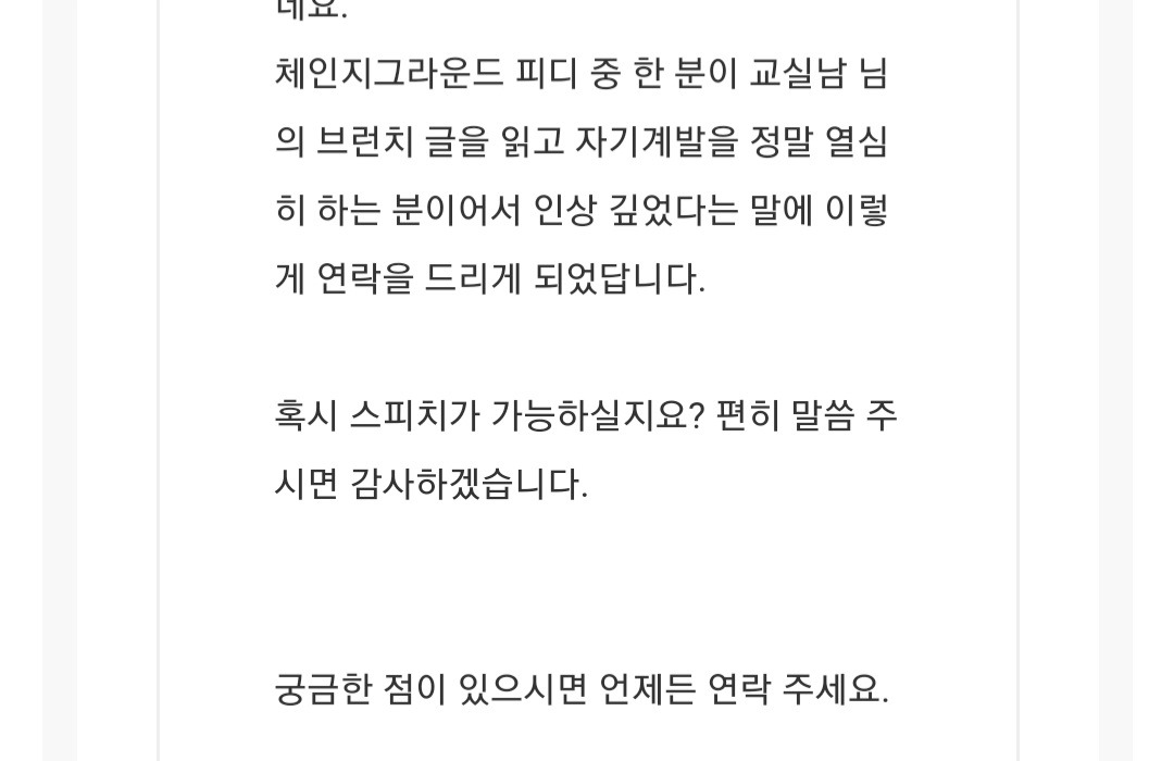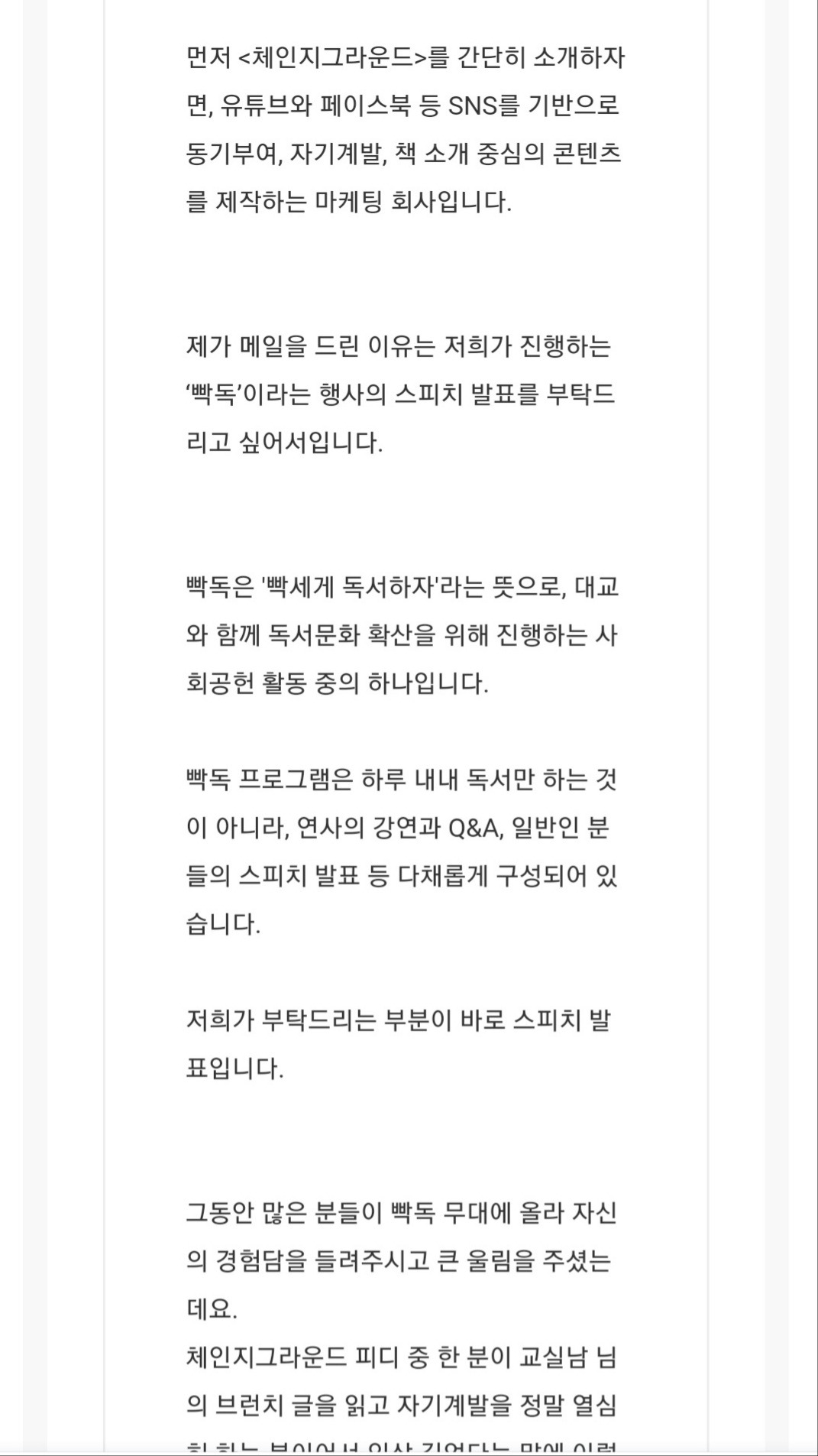 PD님이 주신 제안은 이랬다. 조만간 체인지그라운드와 대교가 주최하는 독서문화 확산을 목적으로 하는 '빡독'이라는 행사가 있는데, 그 행사 안에서 스피치 발표를 부탁하는 내용이었다. 다른 피디님 중 한 분이 내 브런치 글을 읽고 자기계발을 정말 열심히 하는 분(?)이어서 인상 깊었다고 말씀해주셔서 이렇게 제안을 주셨다고 했다.