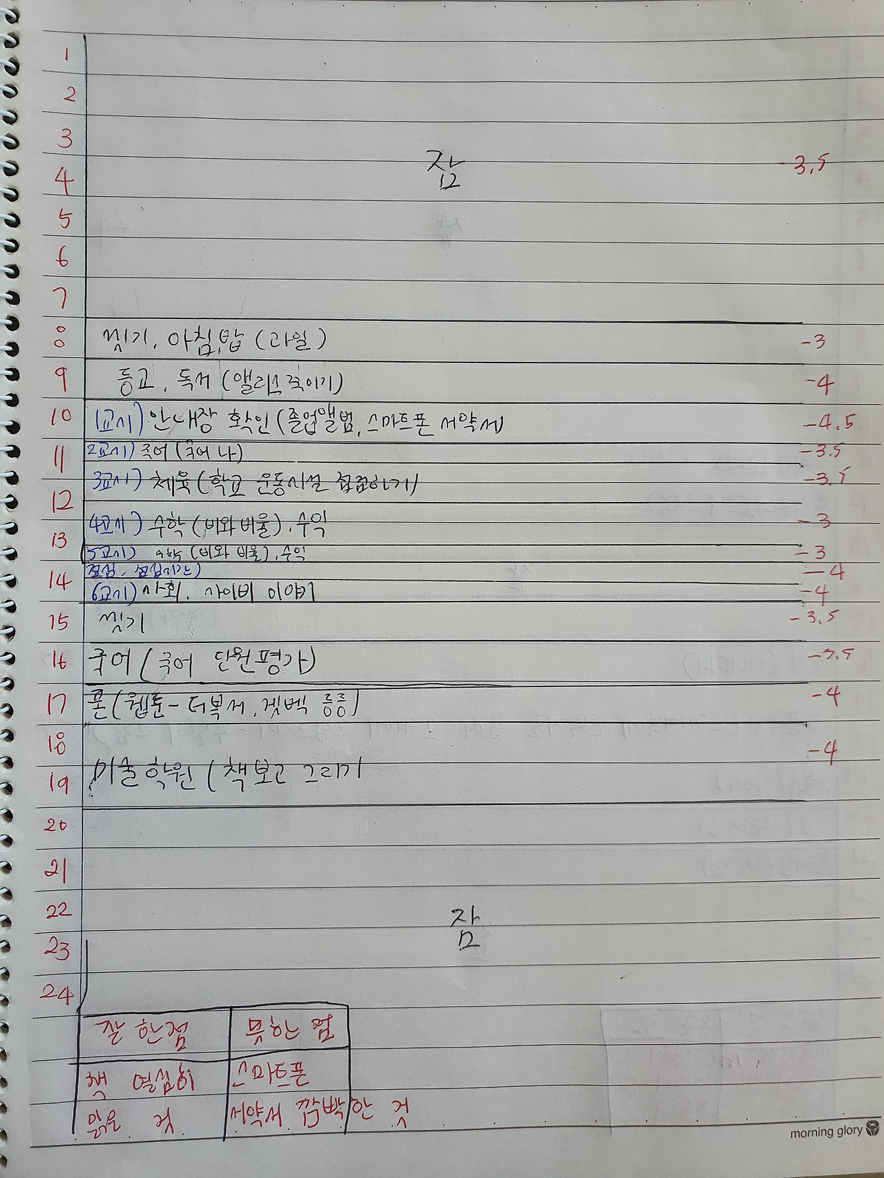 그럼 초등학생이 쓴 데일리 리포트는 어떨까? 반 아이들에게 미리 허락을 구하고, 사진을 찍어왔다. 데일리 리포트를 깔끔하게 쓰는 친구부터 대충 쓰는 친구들까지 가감 없이 보여드리고자 한다.
