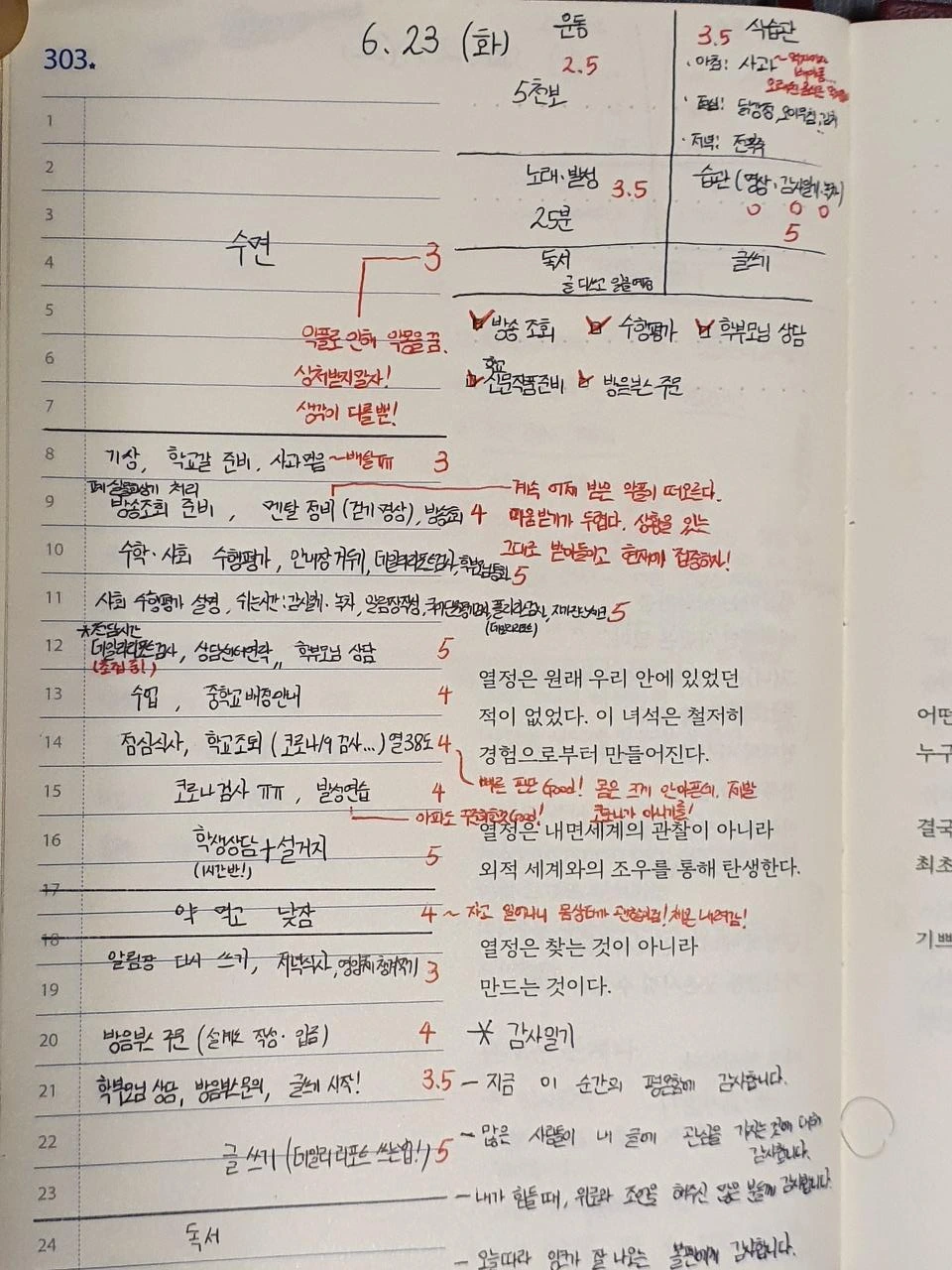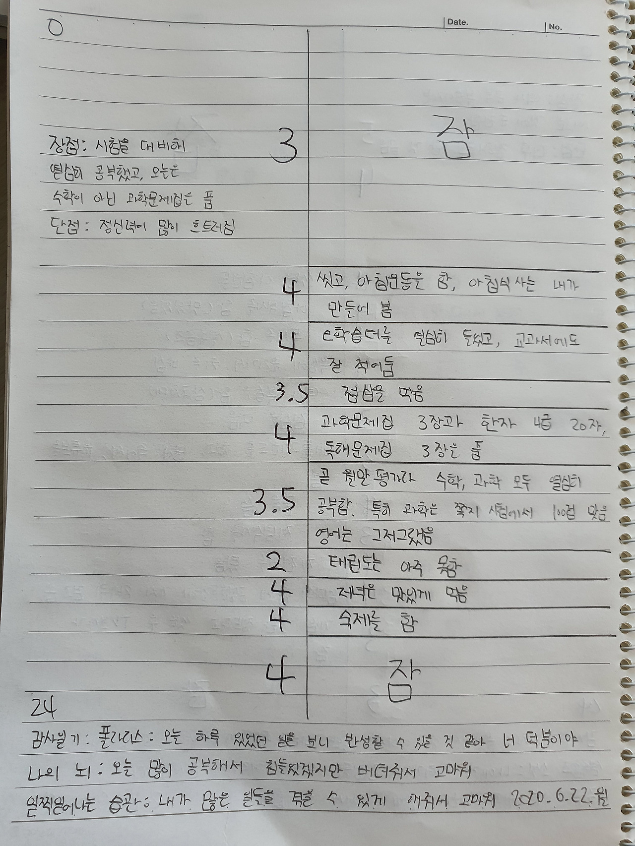 →자신이 한 일에 대해서, 1~5점 사이의 점수를 준다. '1점이 가장 집중 못함. 3점이 평소와 비슷. 5점이 온몸에 기운이 빠져나갈 정도로 미친 듯이 집중함.'이다. 애매한 경우, 나는 소수점을 즐겨 쓴다. ㅎㅎ