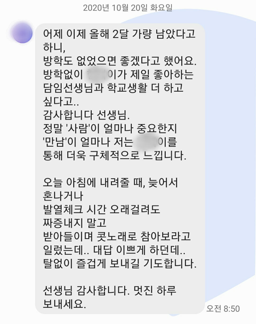세 번째 문자의 경우는 우리 학년에서 가장 말썽꾸러기였던 진석(가명)이의 어머니가 보낸 문자다. 이 친구는 작년에 내 앞에서 스스럼없이 욕을 하고, 고함을 질렀던 친구다. 평소에 친구나 선생님, 그리고 부모님에게도 말을 함부로 하고 분노를 잘 조절하지 못하는 친구였다. 1학기 초부터, 이 친구가 왜 그런 행동을 보이는지 상담을 통해서 계속 이해하고자 했고, 진석이에게 '단지 그런 행동들이 습관에서 나오는 것일 뿐, 네 본성에서 나오는 것은 아니다.'라는 것을 계속 인지시켜 주었다. 다행히 지금 진석이의 상태는 많이 좋아졌고, 지금은 그 누구도 지금 모습을 보고 예전을 떠올리지 못할 것이다.
