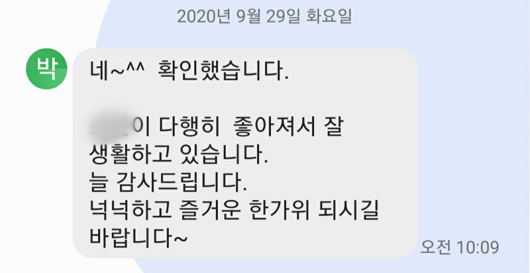 두 번째 문자의 경우는 1학기에 거의 우울증 일보 직전까지 갔던 지은(가명)이의 어머니가 보낸 감사문자다. 5월 즈음에 지은이와의 심층적인 상담을 통해, 지은이의 상태가 심각하다는 것을 알았다. 지은 어머니께 즉시 지은이의 상태를 알렸고, 지속된 대화와 소통을 통해서 지은이의 상태를 호전시킬 수 있었다. 덕분에 외모 콤플렉스, 대인기피증까지 있었던 지은이는 최근에 반장에 뽑힐 정도로 적극적이고 인기 많은 아이가 되었다.