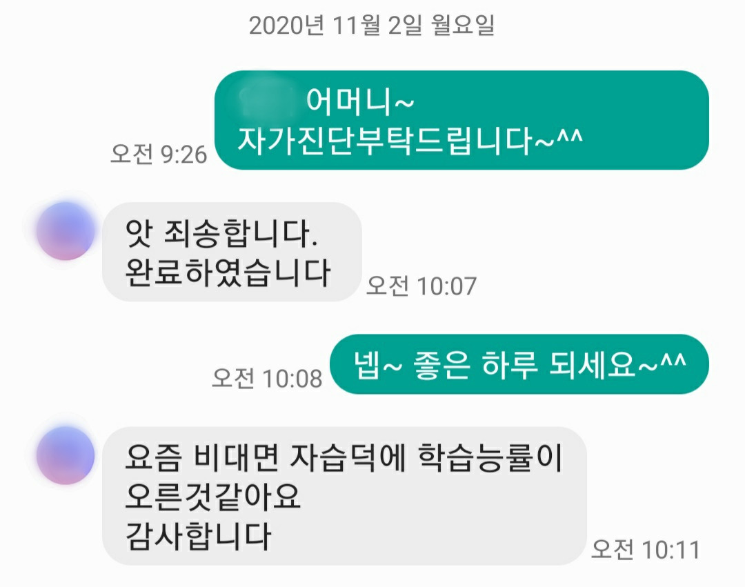 네 번째 문자는 어제 아침에 지연(가명) 어머님께 받은 감사문자다. 최근에 우리 반은 아이들에게 자기계발할 수 있는 환경설정을 마련해 주기 위해서, 줌을 통해서 저녁 온라인 스터디를 운영하고 있다. 처음에 7~8명이었던 스터디원은 이제 23명이 되었다. 저녁 시간에 항상 스마트폰이나, TV, 컴퓨터 게임으로 시간을 낭비했는데, 온라인 스터디 덕분에 학습능률이 많이 오른 거 같다며, 아이들과 부모님들의 반응이 상당히 좋다.