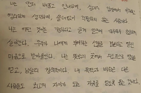 나는 먼저 베풀고 인내하며, 상대의 입장에서 이해하고 영리하게 생각하며, 쓸데없이 걱정하지 않는 사람이다. 나는 어떤 것이든 가능하다고 굳게 믿으며 하루하루 충실하게 살아간다. 우주가 나에게 부여하는 선물을 겸손하고 열린 마음으로 받아들인다. 나는 뜻밖의 곳에서 의도적으로 영감을 얻고, 남달리 창의적이다. 내 목적과 바람은 다른 사람들도 최고의 자아가 되는 자유를 얻도록 돕는 것이다.