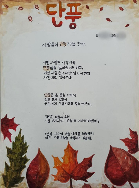 "얘들아, 2학기 학교 신문에 우리 반은 시화로 작품 하나 올리기로 했는데 혹시 참여하고 싶은 사람 있니?"