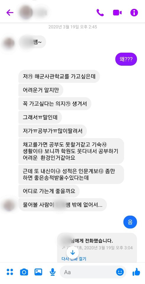 "아마 없을 걸요...?(나중에 전화로 확인해보니 없었음) 제 생각에는 확실히 사관학교 쪽으로 갈 거면, 더 늦기 전에 인문계 학교로 전학 가는 게 맞는 거 같아요."