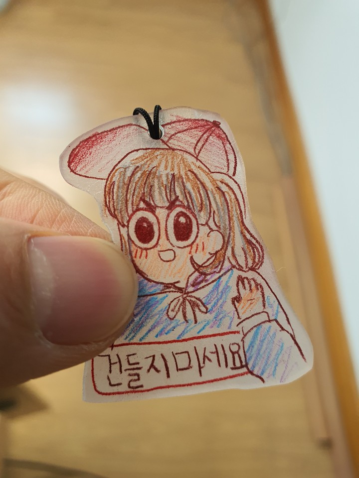 "선생님, 이 종이는 슈링클스라고 하는 건데요. 플라스틱 재질 종이인데, 오븐으로 구우면 크기가 7분의 1 정도로 줄어들어요. 이걸로 애들이랑 키링이나 휴대폰 고리 만들고 싶어요. 근데 선생님이 좀 준비해주셔야 할 게 있어요."