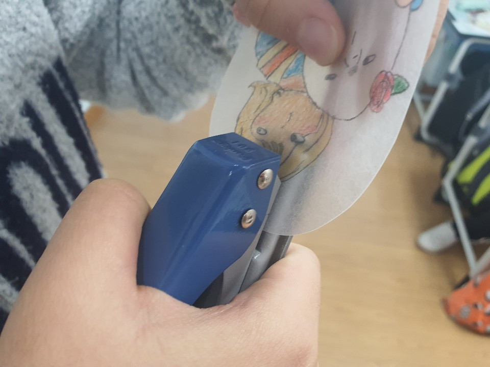 "그림 다 그린 친구들은 가위로 잘라주세요. 그리고 펀치기로 링이 들어갈 수 있는 구멍을 뚫어주세요."