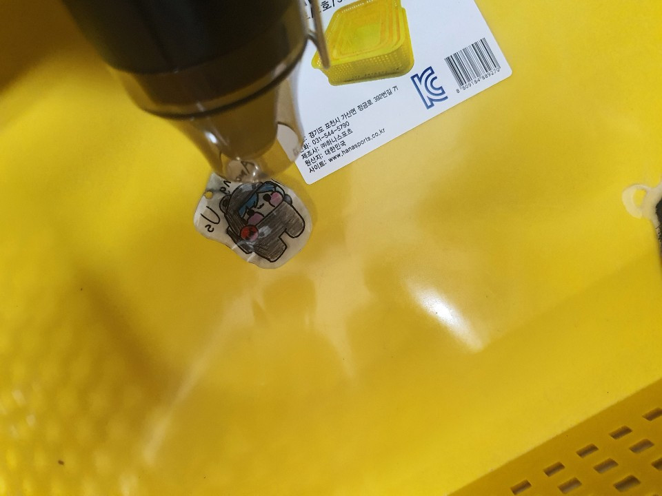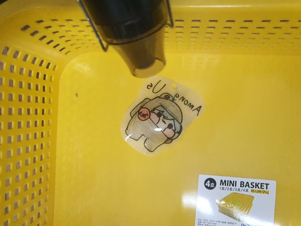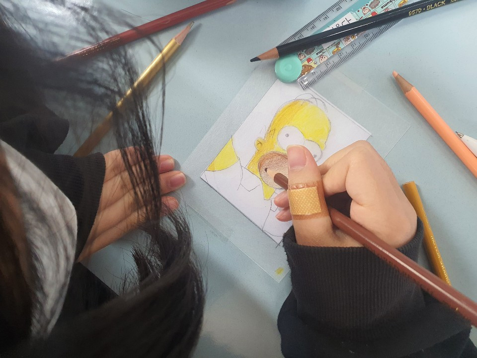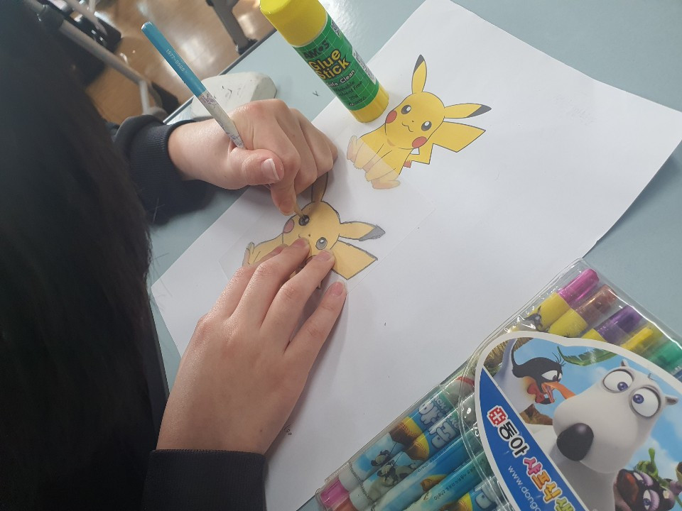 미리 준비해온 캐릭터 도안을 보고 슈링클스의 거칠거칠한 면에 그림을 그리기 시작하는 아이들. 도안을 보고 그려서 그런지 생각보다 그림을 잘 그려서 깜짝 놀랐다. 한 가지 팁을 주자면 이때 돌려 쓰는 색연필보다는 연필 색연필이 더 낫다. 돌려 쓰는 색연필은 힛툴로 열을 가했을 때, 녹아 번질 수 있기 때문이다.