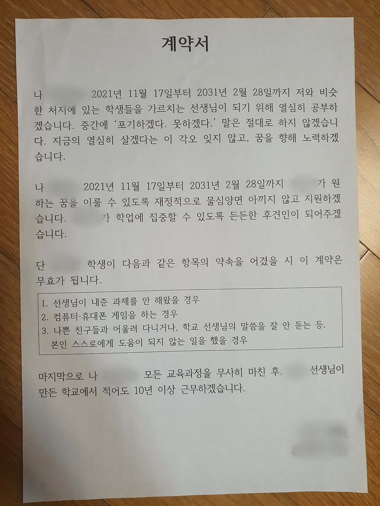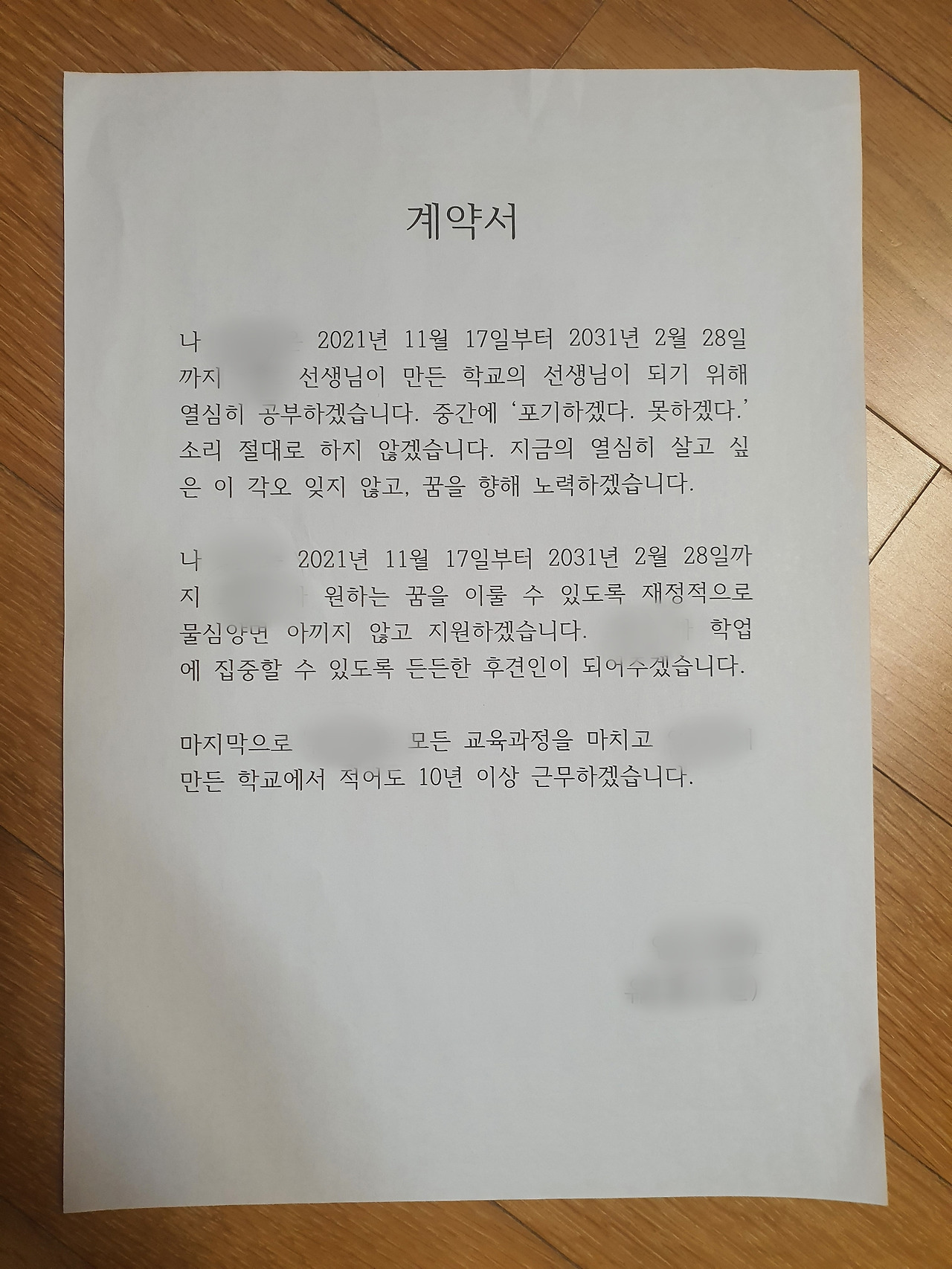 우선 어제 작성했던 계약서 내용을 수정하기로 했다. 기존의 계약서는 약속을 어겼을 때의 페널티가 전혀 없었다. 또 예전처럼 흐지부지 되거나 오히려 선생님이 학생에게 공부 좀 제발 해달라고 사정하게 되는 주객전도의 상황이 될까 봐 걱정이 되었다. 그래서 의찬이와 의논을 해서 내용을 조금 수정했다.