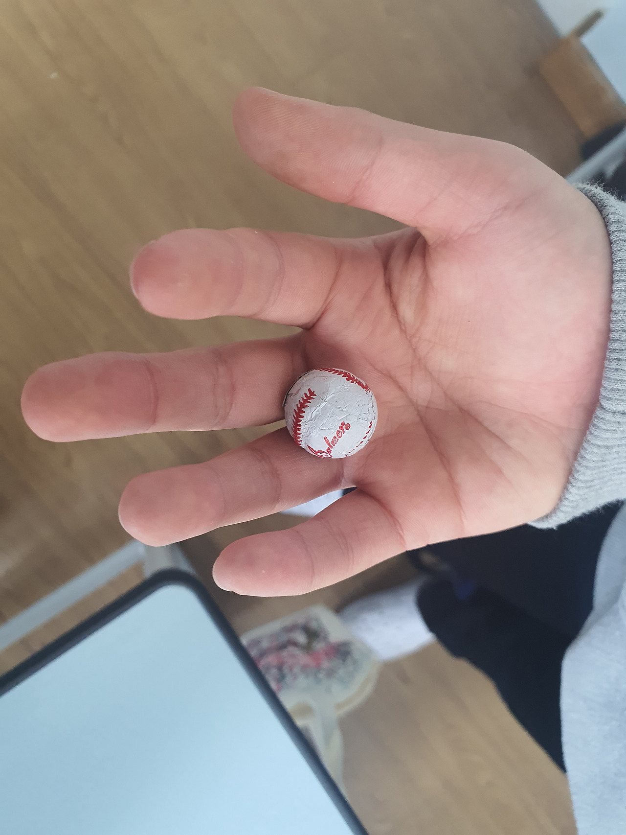 "선생님, 저는 진짜 제 마니또가 누군지 모르겠어요. 제 마니또가 저한테 해준 거라고는 아침에 제 책상 위에 올려둔 이 야구공 모양의 초콜릿 하나밖에 없어요."