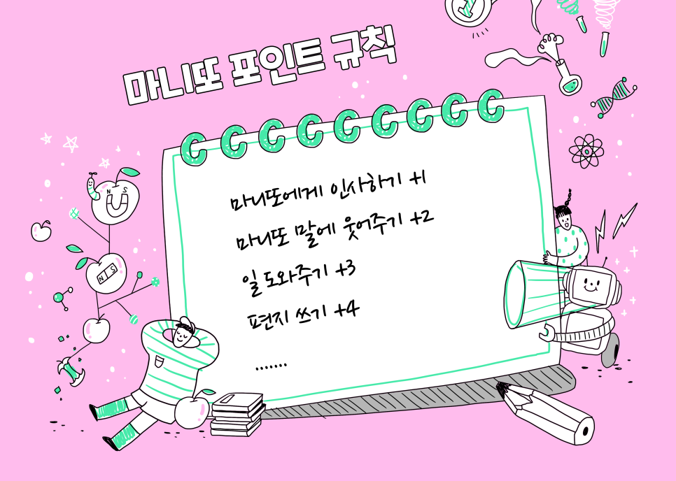 이번에는 좀 더 체계적이고 재미있게 운영을 하고 싶어서, 마니또 미션 수행지를 만들었습니다. 아이들이 성장하는 기분과 성취감을 느낄 수 있게끔, 선행을 할 때마다 마니또 포인트를 올릴 수 있도록 했습니다. 예를 들면, 마니또에게 인사를 하면 1점, 마니또의 말에 웃어주면 2점, 일을 도와주면 3점, 편지를 쓰면 4점 이런 식이었습니다. 마니또 포인트를 많이 쌓은 친구에게는 상을 주기로 했습니다.