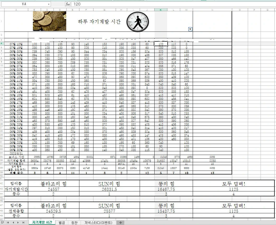 대신 한 달 동안 자기계발 시간을 측정해서, 자기계발 순위 상위 4명은 선생님과 주말에 놀러 가는 보상을 추가로 만들었다. 대부분의 아이들은 주말에 선생님과 함께 놀러 가는 것에 대한 로망이 있다. 영화를 보거나 선생님 집에 놀러 가거나, 바닷가에 가거나, 아니면 그냥 함께 있는 것만으로도 좋아한다. 특히나 우리 반 아이들은 유독 나를 좋아하고 잘 따랐다. 주말에 선생님과 함께 놀 수 있다고 하니, 다들 학습의욕을 불태웠다. 게다가 시험을 쳐서 점수대로 순위를 매기는 것도 아니고, 학습 시간을 채우는 엉덩이 싸움이지 않은가? 10명 중에서 4명 안에만 들어도 선생님과 놀 수 있다고 하는데, 얼마나 좋은 기회인가?