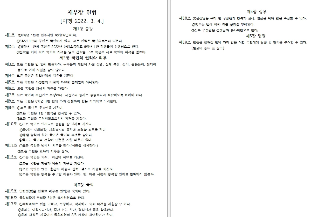 아이들과의 1년 생활 중, 내가 가장 중요하다고 생각하는 시기는 학기 초 1~2주이다. 이 시기에 주로 아이들과 함께 학급 규칙 만들기, 1인 1역 정하기, 자기소개, 친교 활동, 자리 바꾸기 등을 하는데 이를 통틀어 학급 세우기라고 한다. 나는 학급 세우기가 어느 정도 수준에 도달할 때까지는 교과 수업을 하지 않는다. 학급 내 규칙도 없고, 선생님, 친구들과 친해지지 않은 상태에서 무슨 재미로 공부를 한단 말인가?