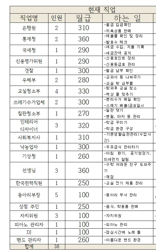 이런 아쉬움을 가진 채 중국의 한국국제학교에 왔는데, 이곳의 아이들 또한 세금 내는 아이들 학급경영 시스템을 원했다. 하지만 기존에 27명의 아이들로 돌아가던 시스템이 10명의 아이들로 돌아갈 리 만무했다. 직업들을 아예 줄이거나, 아니면 시스템 자체를 아예 바꿔야 했다. 이전에 시도는 실패라고 봤기에 난 시스템을 아예 바꾸는 걸 선택했다.