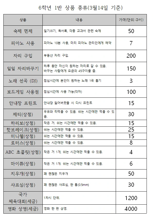 실행 초기, 아이들의 반응은 폭발적이었다. 학급 안에서 열심히 활동(공부, 발표, 1인 1역, 선생님 심부름(아르바이트))만 하면 학급 화폐(돈)를 벌 수 있고, 번 돈으로 학급 내 상점에서 간식을 구매하거나 자리 이동권, 숙제 면제권 등을 살 수 있다니 얼마나 학교 생활이 재미있겠는가.