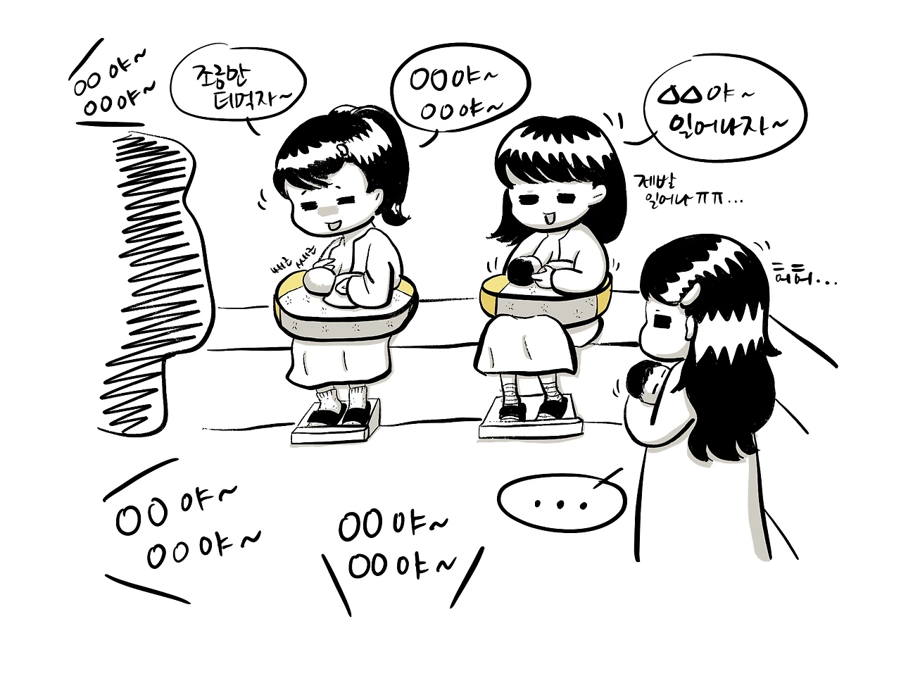 다른 한편엔 아가의 이름을 부르며 계속 깨우고 있는 엄마들을 볼 수 있다.