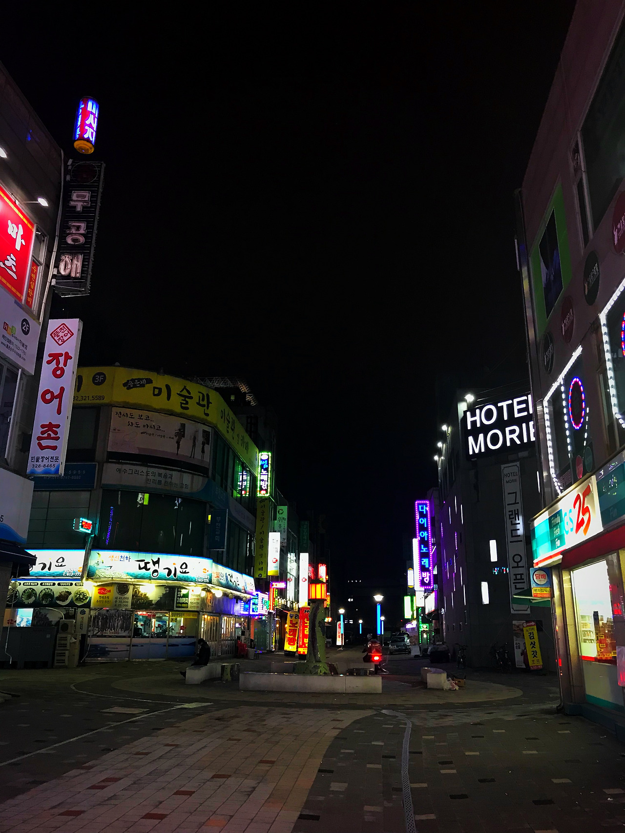 원근법스럽게 펼쳐진 상가들은 향락의 빛으로 날 보호하는 것처럼 보인다.