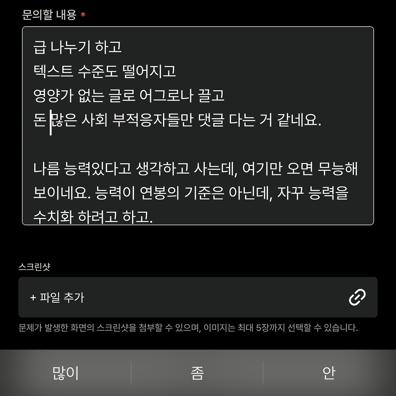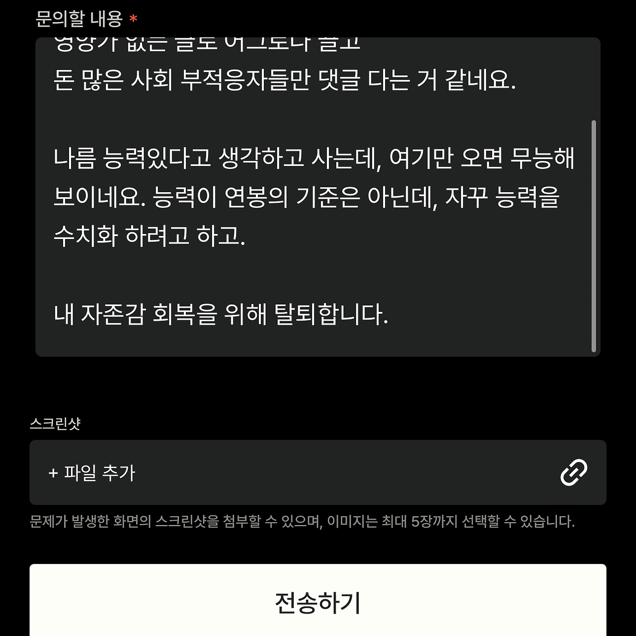 1:1 문의에도 그리고 탈퇴 사유에도 남겼습니다. 분노 섞인 말투라 맥락이 없긴한데, 퇴고 없이 날려버렸습니다.