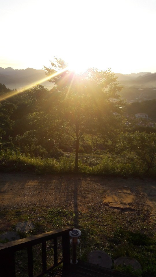 후속 강의와 토론은 밤 늦게까지 이어졌고, 새로 만난 사람들과 술도 한잔 하다보니 새벽 3시를 넘겨 잠자리에 누웠다. 장시간 수업으로 인해 디스크로 고생중인 허리 상태가 좋지 않았다. 설상가상 잠이 쉬이 오지 않았다. 많이 피곤했지만, 머리속에는 정리되지 않는 여러가지 상념들이 가득했고, 이성적으로 이들의 정체를 파악하는 것이 쉽지 않았다. 피로나 풀어보려는 요량으로 그냥 눈을 감고 누워있었다. 얼마를 뒤척거렸을까, 갑자기 밖이 환해지는 느낌에 눈을 떴다. 새벽 4시30분이었다. 통창문 밖으로 말갛게 일출의 기운이 느껴졌다. 엉거주춤 옷을 주워입고 밖으로 나가 벤치에 앉아 해가 뜨기를 기다렸다. 새털구름에 가려 선명하지는 않았지만, 샛노란 해가 산과 산사이에서 그 모습을 드러냈다. 여우숲에 아침이 오고 있었다. 온갖 새들이 감미롭게 지저귀고 있었고, 솨아 바람소리에 나뭇잎들이 기지개를 켜고 있었다. 금새 눈부시도록 장엄해진 태양은 쳐다보는 것을 허락하지 않았다. 온 생명이 태동하는 무아지경이 내 눈앞에 펼쳐지고 있었다.