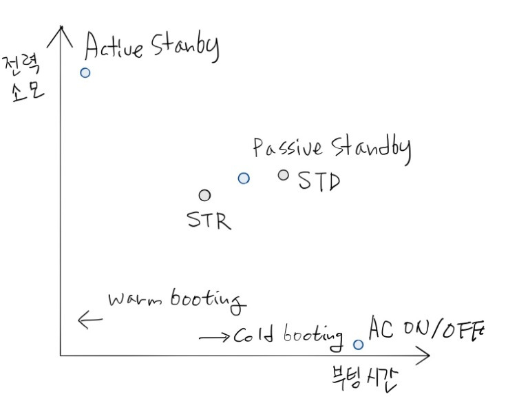 스탠바이 모드는 크게 능동대기 모드(Active Standby)와 수동대기 모드(Passive Standby) 이렇게 2가지로 구분됩니다. 즉, 세트가 꺼지고 켜지는 것은 Standby On/Off(Passive, Active) AC On/Off 이렇게 가능하니 아래와 그림으로 보면 되겠네요.