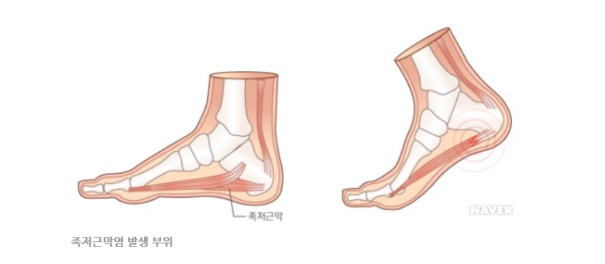 족저근막염이란 발바닥 근육을 감싸고 있는 막에 생긴 염증을 말한다(네이버 지식백과 참조). 증상으로는 아침에 일어나 발을 디딜 때 심한 통증, 발 뒤꿈치 혹은 발바닥 통증 등이 있다. 원인은 장기간 밑창이 딱딱한 신발 착용, 과체중, 오랜 시간 서 있거나 많이 걸었거나 등이다.