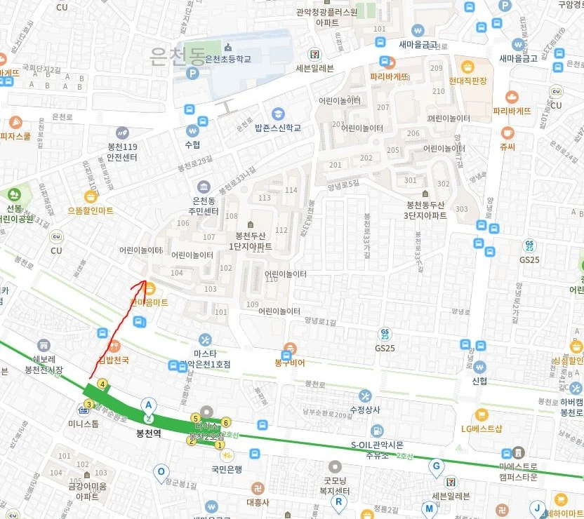 필자가 원하는 집 조건 중 하나가 관악구의 집을 구하는 것이다. (전편 참고: 경매로 신혼집 구하기) 그러다 보니 봉천, 신림 부근 물건을 주로 본다. 아시겠지만 관악구는 산을 깎아 집을 지었기 때문에 주택가로 들어갈수록 집 가는 길이 등산과 비슷하다. 언덕 2개 집도 비슷한 케이스다. 지도에서 보기로는 봉천역에서 멀어 보이지 않았다. 일단 가보자 하고 남자친구를 데리고 길을 나섰다. 봉천역 4번 출구에서 내려 횡단보도를 건너면 야트막한 부지에 주택과 아파트가 보이고 좀 더 걸으면 본격적으로 언덕길이 시작된다.