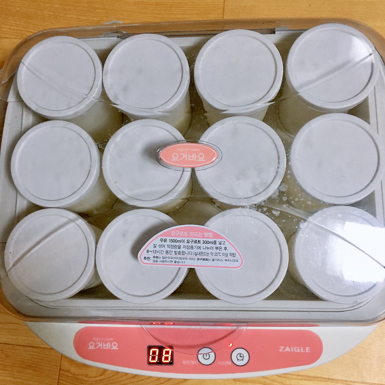 준비가 끝나면 우유와 요구르트를 넣고 섞는다. 각 병에 따라준 뒤, 제조기에 넣는다. 우유 900ml로 만들면 병에 반씩 채우고 1L 우유를 넣었다면 반을 조금 넘기게 담아준다. 그런 다음 8시간으로 맞춰주면 끝.