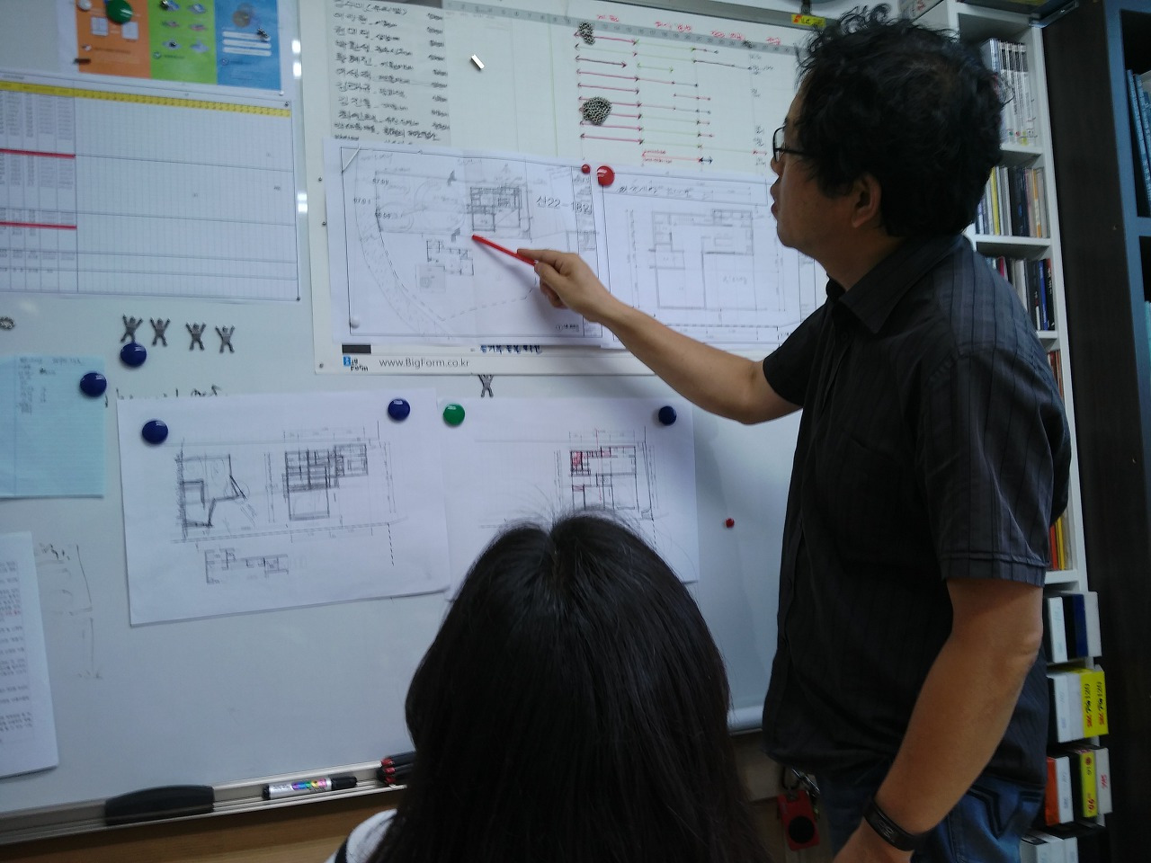 설계도를 그릴 때. 저희는 계약기간을 1년으로 했습니다. 1년 동안 건축사님의 수고가 워낙 많았기 때문에 지금의 집에 만족할 수 있었습니다. 다른 사람들이 3개월 안에 뚝딱 마치고 바로 시공에 들어가는 부분을 우리 부부는 밤마다 토의를 통해서 1년간 검토를 하고 기초를 시공했습니다. 그 결과 집의 동선에서 꼬이거나 불편함 없이 살 수 있었고. 건축 시에도 복잡하지 않은 설계로 인해서 건축비를 아낄 수 있었습니다.