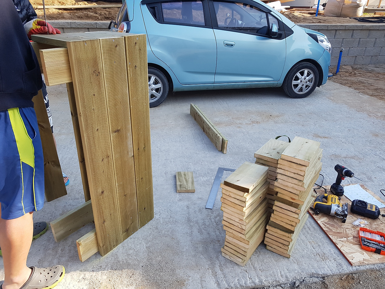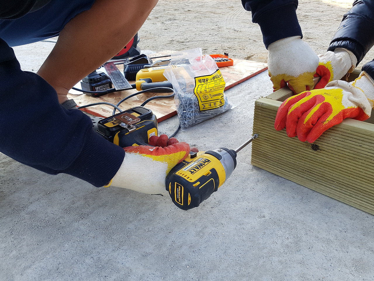 도훈파파님의 설명에 따라 나무를 제단하여 준비하는 모습.