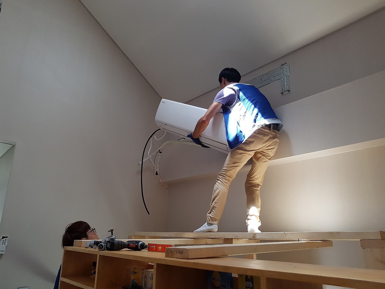 야간에 잠을 자지 못해서 아내와 저는 불면증으로 인한 피로. 수면부족으로 인한 불쾌감을 겪게 되었습니다. 에어컨 배관을 미리 빼놓고 전기공사가 되어 있었기 때문에 에어컨만 설치면 되는 상황이었죠.