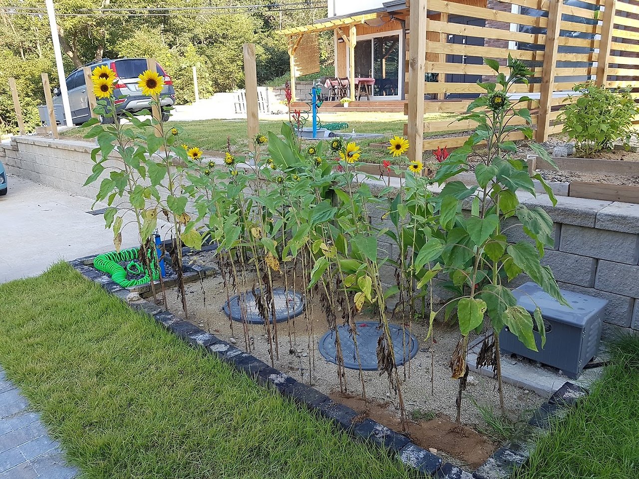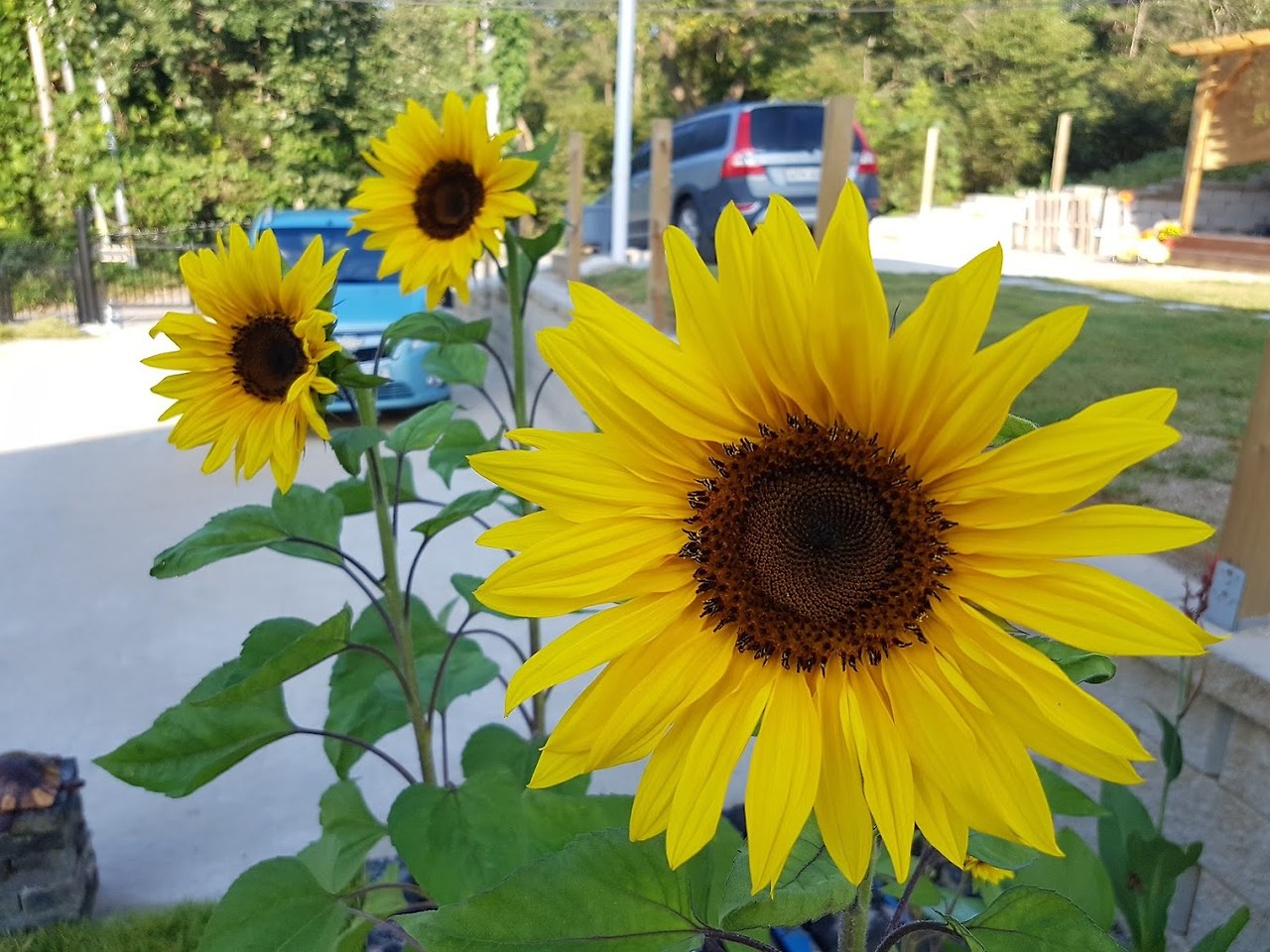 그리고 집을 짓고 나서 마을 개천에 있는 해바라기에서 씨를 얻었습니다. 그 씨를 그리고 집을 지은 후에 심어 놓았습니다. 밭에 두세 알씩 짝을 지어서 심었는데. 조경이 한두 달 공사가 연기되면서 살짝 늦은 감도 있습니다. 그리고 드디어 거의 모든 해바라기들이 꽃을 피우기 시작했습니다.