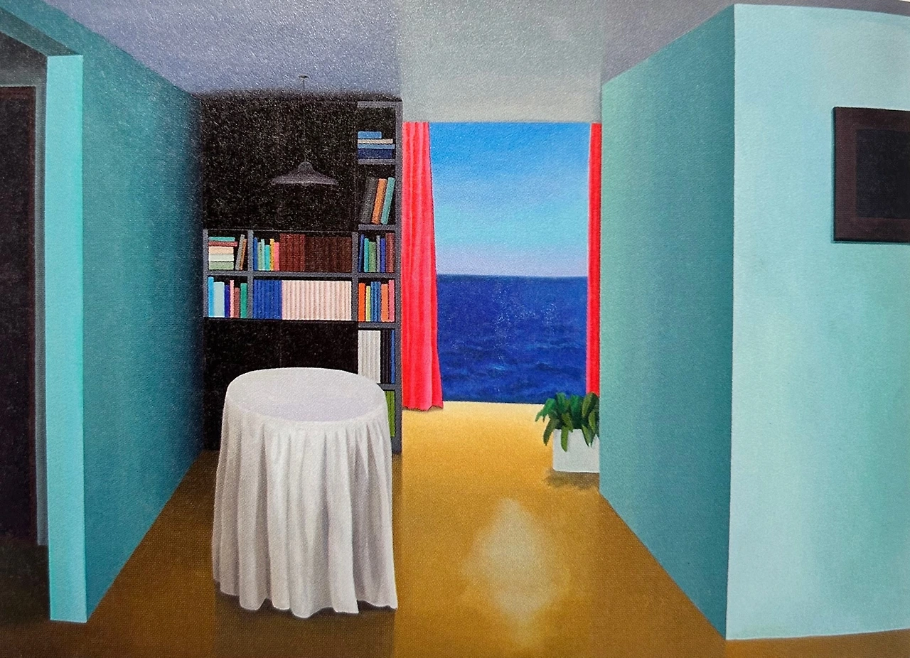 반듯한 수직, 수평선으로 그려진 실내 풍경에 무의미한 둥근 테이블이 균형을 맞추고 있고, 벽이 없는 정면으론 푸른 바다가 보인다. 작가의 고향이 바다일까? 혹은 도시인이 자연을 그리워하는 마음을 노스탤지어라는 단어로 상징해서 보여주는 걸까? 둘 중에 뭐가 됐든 주제가 상투적이다. 그럼에도 불구하고 이 그림은 전혀 뻔하지 않다. 그 이유를 알고 싶다.