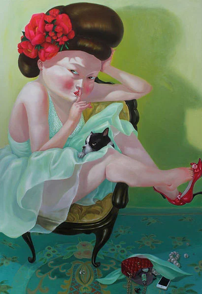 카메라, 또는 감상자를 향해 조용히 하라는 손가락을 들어 보이는 인물은 꽤나 차림새가 화려하다. 한껏 부풀린 머리와 꽃장식에, 아마 직전까진 목에 차고 있었던 듯 바닥에 널브러져 있는 진주 목걸이까지. 무대에 섰던 걸까? 파티를 즐기고 온 걸까? 하지만 이전에 얼마나 화려한 시간을 보냈든 간에 지금은 자신과 똑 닮은 반려 동물과 함께하는 휴식타임이니 그 누구도 이 시간을 방해하면 안 된다는 눈빛이다. 강아지도 외출했다 돌아온 주인과 오붓한 시간을 보내야 하기에, 우리를 방해했다간 가만두지 않겠다는 듯 화면을 흘겨본다. 흘김에는 경계의 메시지도 있지만 “너도 내가 부럽지?”라는 목소리도 들리는 듯하다. 둘은 지금 이 순간 완벽한 팀이다.