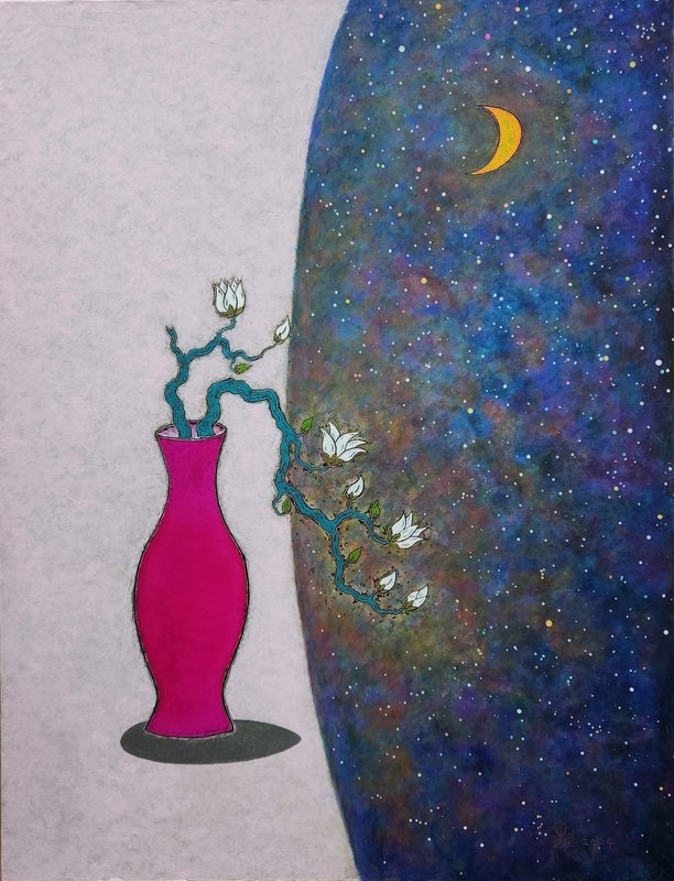 담백하고 단정한 낮에 자리한 핑크색 화병은 밤을 향해 가지를 뻗어내고 있다. 하얀색 꽃은 반짝이는 별과 오묘한 색이 뒤섞여 다채로운 꿈을 품고 있는 밤으로 빠져들고 싶어 한다.