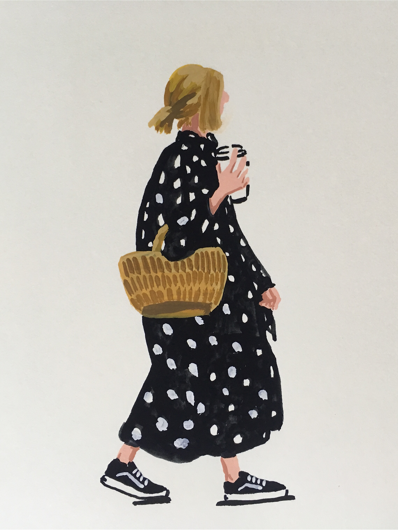 한동안은 그림을 거의 그리지 않았다. 마음에 여유가 없었기도 하고, 매일의 삶을 챙기는 것도 버거웠다. 그렇기에 삶의 우선순위에서도 그림은 조금 더 뒤에 밀려났다. 어쩌면 그리기에 묻어 나도 조금 더 밀려났을지도 모르겠다. 오전엔 첼시를 돌보고 출근을 하고, 퇴근 후에는 집안일을 했다. 그런 틈에도 종종 그리고 싶었다. 일주일에 한 번, 퇴근 후 워크숍에 참여하기도 했으나, 잘 마치지는 못했다. 아침에 좀 더 일찍 일어나 그림을 그려볼까 했지만 늘 방전이었다. 그리지 않는 생활은 어느 면에서는 편리하나, 공허하다. 재미없는 사람이 된 것 같았다. 시간이 지날수록 생활은 점점 단순해지고 점점 더 무료해졌다. 나는 재미있는 프린트가 가득한 원피스나 알록달록하고 커다란 스웨터를 좋아했다. 결혼을 하고 학원에서 일을 하면서부터 나는 프린트가 가득한 원피스나 스웨터를 사지 않았다. 일하기 편하고 관리하기 쉬운 청바지에 맨투맨을 매일 입었다. 스스로 눈치채지 못했지만 효율성을 내세우며 스스로 취향을 지워냈다. 어떤 날은 너무도 속상했다. 아이까지 갖고 나면 내가 설 자리가 더 없어질까 무섭다. 쓸쓸하고 불안한 지금의 마음에서 벗어나려면 뭐든 해야만 한다. 다시 좋아하는 것을 맘껏 좋아해 보자고 생각했다.
