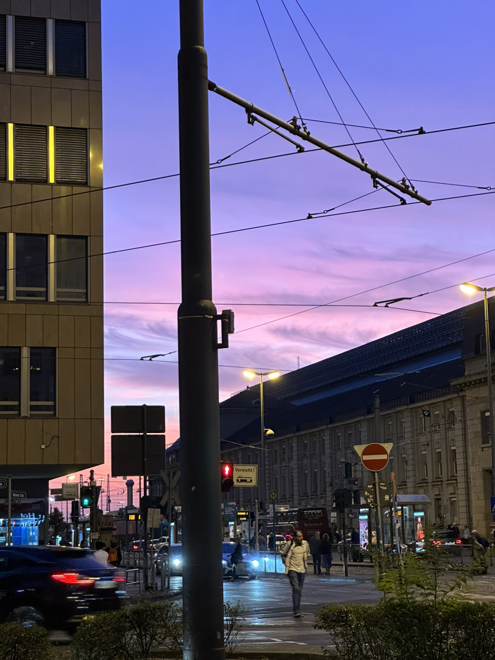 10분 정도 달려 외진 공항에서 시내로 들어서니 수많은 Skyscrapper가 보였다. 아 내가 진짜 독일 땅을 밟았구나. 마침 보랏빛 노을이 지던 찰나에 택시가 대교를 가르지르는 순간, 여러가지 감정이 교차했다.